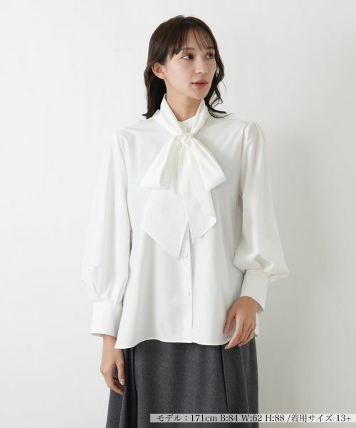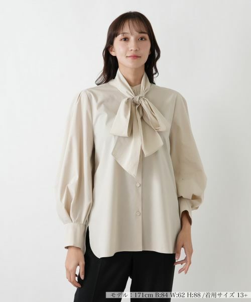優雅なタイが付属した、スタンドカラーブラウス。コットン、ポリエステル、ポリウレタンをブレンドした素材は、適度なストレッチ性があり、快適な着心地です。スタンドカラーは首元をすっきりと見せ、洗練された大人の女性の品格を演出いたします。ご自宅で手洗いできるウォッシャブル仕様で、日常のお手入れも簡単。シンプルな無地デザインなので、タイの結び方一つで様々な表情をお楽しみいただけます。オフィスシーンはもちろん、お食事会や学校行事など、様々なフォーマルな場面で活躍する汎用性の高い一枚です。