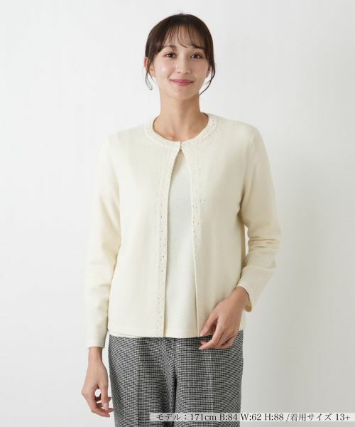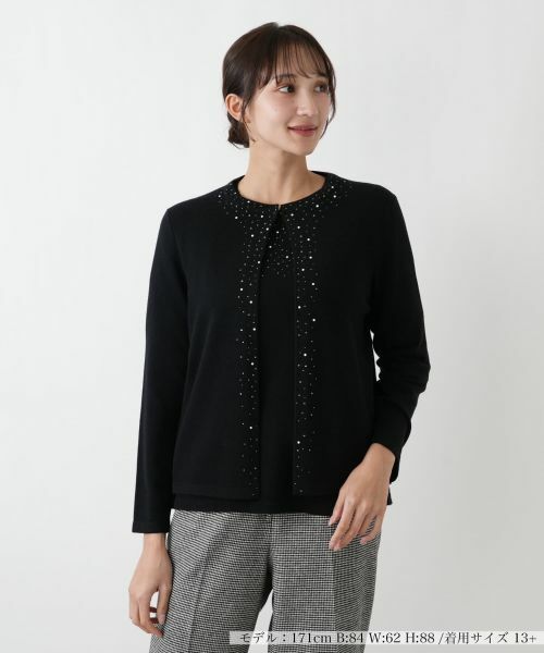 首まわりから前立てにかけて散りばめられた、きらめく小さな飾り付けが、装いに華やかな光沢をもたらします。この繊細な装飾は、顔まわりに上品な輝きを添え、全体の印象を明るく演出します。なめらかな肌触りの生地が心地よく体を包み込み、ゆったりとした身頃と自然に落ちる肩のラインが、柔らかな雰囲気を醸し出します。手首をすっきりと見せる長袖と、無駄のないシンプルなシルエットは、洗練された印象を与えます。日常の着こなしに羽織るだけで、上品さとさりげない華やかさをプラスする一枚です。