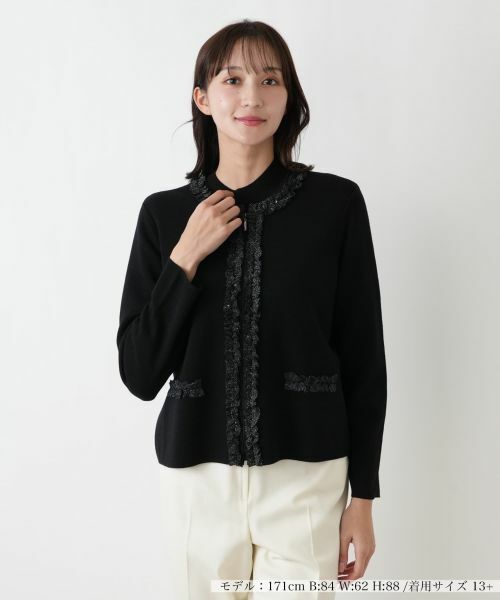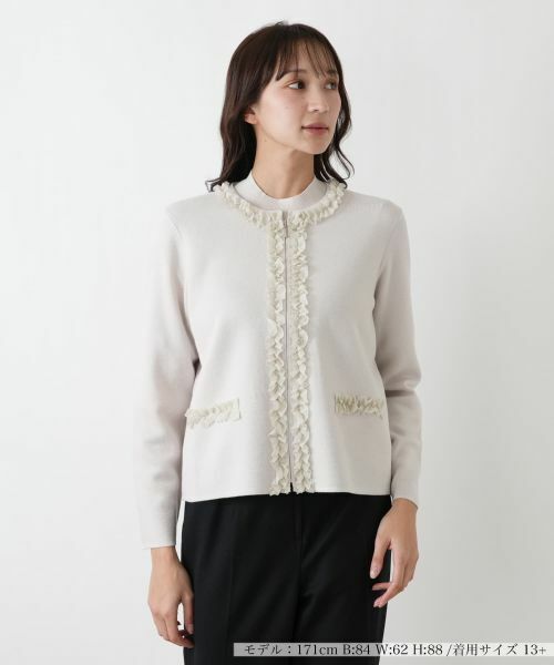 上質な毛100%を贅沢に使用した、暖かく柔らかな肌触りのノーカラーカーディガン。洗練された無地デザインは、様々なインナーやボトムスと合わせやすく、着回し力も抜群です。ノーカラーの丸首デザインは、デコルテラインを美しく見せ、上品な印象を与えます。ナイロンとポリエステルをブレンドした部分使いが、控えめながらもデザインのアクセントになっています。セットアップとしてもお召しいただける、汎用性の高い一枚です。季節の変わり目の羽織りとして、また冬にはアウターの下に重ねるなど、長くご愛用いただけるタイムレスなデザインです。