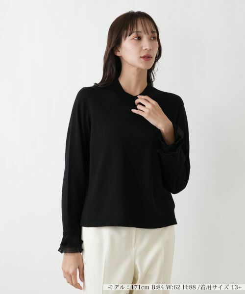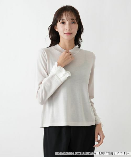 袖口にあしらわれた、異素材の二段フリルが手元を華やかに飾ります。首元に沿うように仕立てられた細かなリブ編みが、顔まわりをすっきりとした佇まいに見せます。肌がほのかに感じられるほど繊細な編み地は、滑らかで軽やかな着心地です。一枚で着るのはもちろん、重ね着で袖口のフリルを覗かせる着こなしも楽しめます。