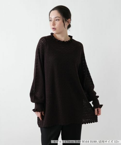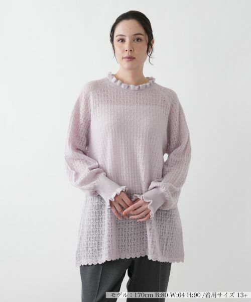 襟元と袖口にあしらわれたフリルが、顔周りと手元に優雅な表情を添えます。全体に施された繊細な透かし編みが、軽やかな印象と奥行きのある表情を生み出しています。柔らかな生地感とゆったりとしたシルエットが、リラックス感のある着心地と女性らしいしなやかさを両立。長めの丈と裾のスカラップカットが、装いにさりげないアクセントを加え、一枚で着るだけでなく、重ね着にも調和します。