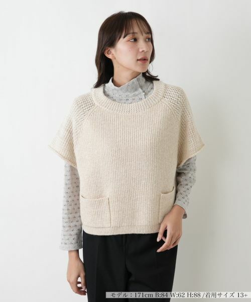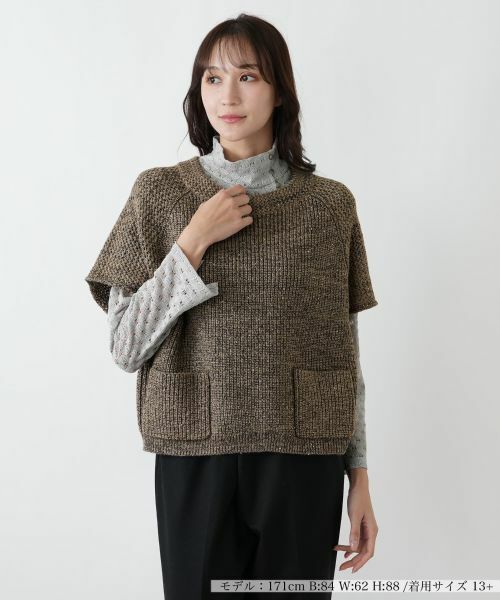 表情豊かな素材感が魅力の、その他襟が特徴的なベスト。ポリエステル、アクリル、ナイロン、毛をブレンドした素材は、暖かみがありながらも軽やかな着心地です。無地ライクな落ち着いた色合いは、どのようなコーディネートにもなじみ、上品な印象を保ちます。独特の襟のデザインが、顔周りをすっきりと見せ、洗練された大人の女性のスタイルを演出いたします。季節の変わり目の羽織りとして、また冬にはインナーとして、長くご愛用いただけるタイムレスな一枚です。シンプルながらも個性を感じさせるデザインで、ワードローブに奥行きをプラスします。