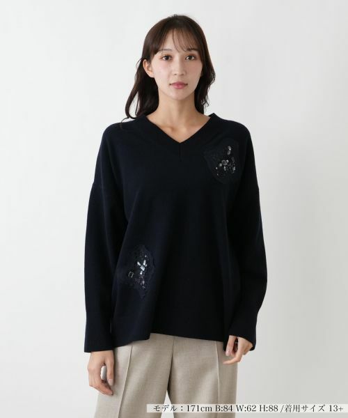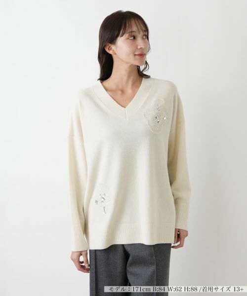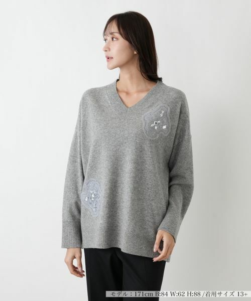 深く切り込んだVネックラインがデコルテをすっきりと見せ、首元には細やかなリブ編みが施され、全体のシルエットに洗練された印象を加えています。体を優しく包み込むようなゆったりとした身頃は、肩の線を柔らかく見せるドロップショルダーで、腕周りにも適度なゆとりを持たせ、リラックス感のある着心地を提供します。左胸と左裾にあしらわれた不規則な輪郭のモチーフには、シアーな布地の上に、繊細なビーズや様々な形状のカットストーンが丁寧に組み合わされ、光を受けてきらめき、装いに華やぎを添えています。この装飾は、手仕事を感じさせる複雑なレイアウトで、一枚の生地に奥行きと表情を与えています。密に編み込まれたような編み地は、均一で上品な質感を感じさせます。袖口と裾に配された幅広のリブ編みは、全体のゆとりと調和しつつ、シルエットにさりげないメリハリを与えています。