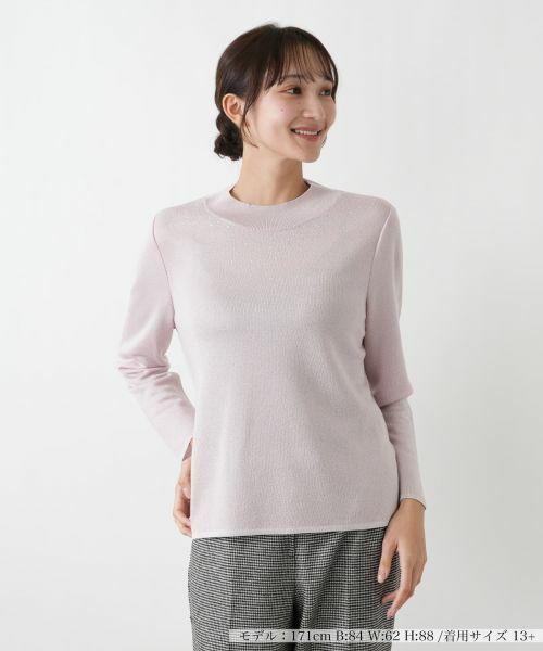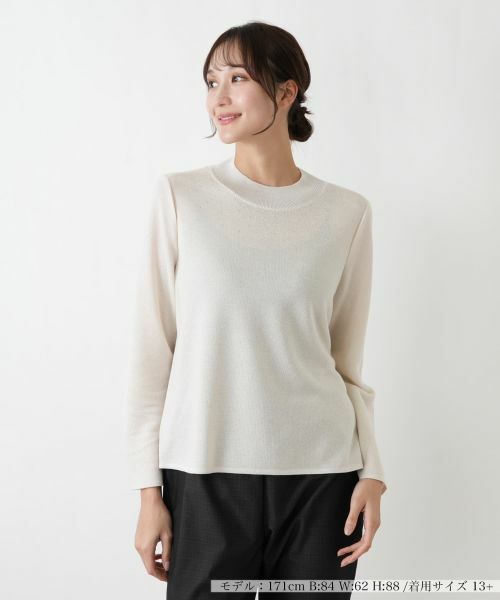 首元に沿うような詰まったデザインに、小さなきらめきが繊細に散りばめられ、デコルテラインに上品な輝きを添えています。生地表面の微細な凹凸が、光を受けるたびに豊かな表情と洗練されたきらめきを放ちます。体のラインに優しくフィットしながらも締め付けすぎないシルエットは、快適な着心地をもたらし、すっきりと伸びる長袖とともに、全体に洗練された印象を与えます。シンプルながらもディテールにこだわったデザインが、様々なコーディネートに華やかさをプラスします。