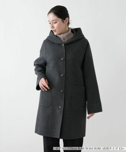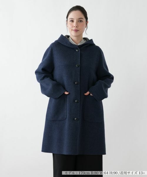 ゆったりとしたAラインのシルエットが、体を優しく包み込み、軽やかな着心地を叶えます。暖かみのある厚手の生地で仕立てられたフードは、首元を優しく彩り、ちらりと覗く裏地の柄がさりげないアクセントを添えます。フロントに配された丸みのある大きなボタンや、実用的なパッチポケットが、全体のデザインに柔らかな印象をプラスします。膝にかかる上品な丈感とドロップショルダーの組み合わせが、こなれた雰囲気を演出し、様々なスタイルに調和します。