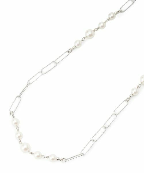 パール調のデザインを一部に施したロングネックレス。上品な雰囲気を演出します。