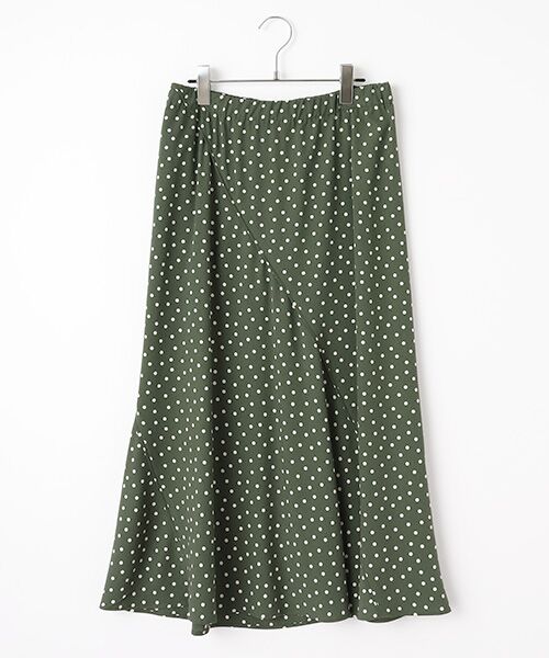 クラシカルなドット柄のロングスカートです。斜めに入ったライン切替からイレギュラーに広がるフレアーがフェミニンなデザインです。