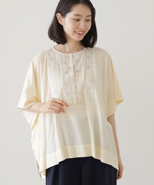 ボタニカルで染めた天然素材の優しい色合いが魅力のアイテムです。フロントのレース切替ヨークがポイントのポンチョスタイルのブラウスです。シンメトリーに流れるドレープがフェミニンなスタイリングにしてくれます。