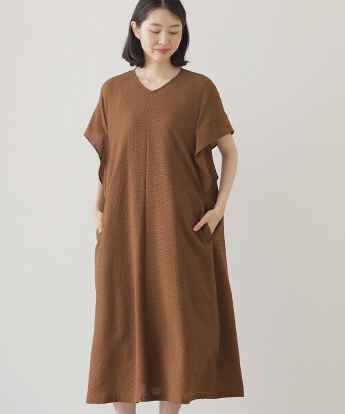 軽く涼しいサッカー素材で作るサマードレスです。袖口から流れるフリルが程よく腕を隠してくれるデザインです。裾に広がるAラインのシルエットで軽やかな着心地が魅力です。デイリーからお食事まで着回し可能なアイテムです。<素材>特殊メッシュ組織の為、通気性、清涼性、軽量性に優れた素材です。縦横にストレッチがあり、吸水速乾の機能を兼ね備えた快適な素材です。