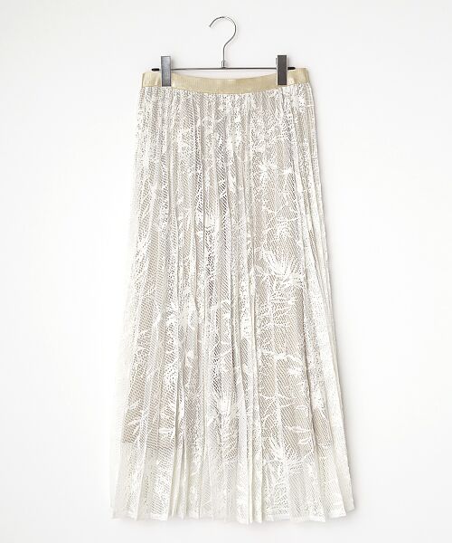 メッシュのリーフ柄でスポーティーな印象のあるレースを使ったプリーツスカートです。裏地にベージュを使う事でレースの透け感と軽さが楽しめる涼しげなアイテムです。ウエストはゴムでイージーに着脱できるのも魅力的です。<素材>ラッセルのジャガード機を使用した大柄レースです。柄の大きさが特徴で刺繍風に見えるレースです。※レース部分への引っ掛けにご注意ください。過度な力が加わると縫い目が開いたり、破れる事があります。