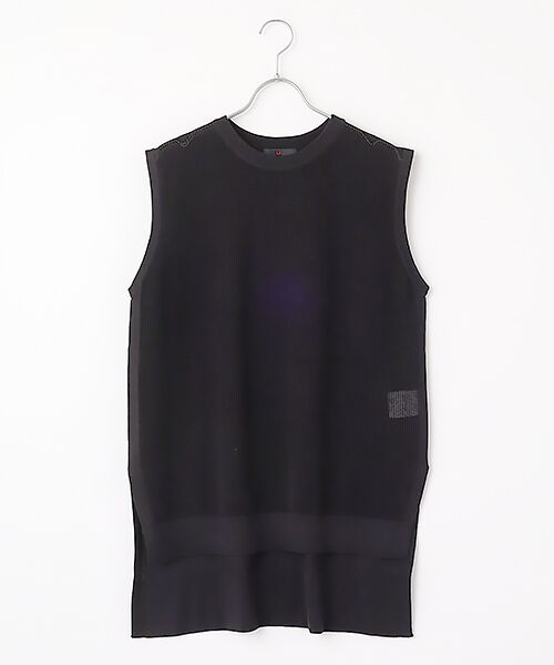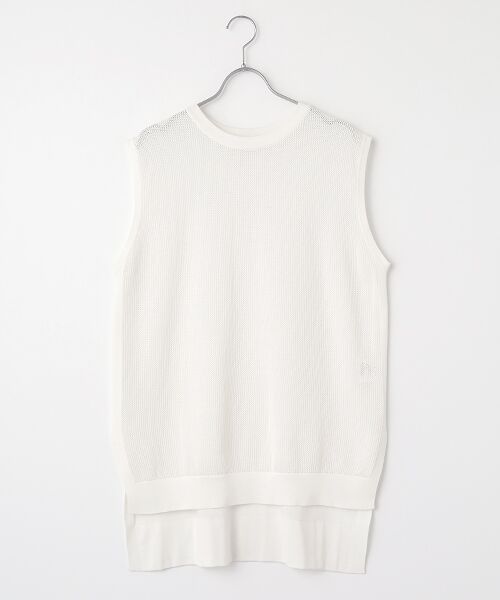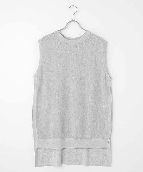 前身頃は細かい透かし柄、後ろ身頃はプレーンな編み地の組み合わせで、シンプルなシルエットながらも編地柄にこだわったロングベストです。