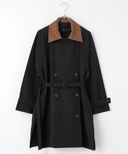 ゆったりとした分量感を膝丈で仕上げたバランスの良いトレンチコートです。ウエストベルトを締めてクラシックに着用するのもお勧めです。フェイクレザーの配色襟がトレンド感のある着こなしにしてくれます。襟は取り外しができ、印象の変化を楽しめるデザインです。<素材>従来のコットンポリエステルの素材とは異なり、高密度に織られた素材です。ハリ感があるので立体的なシルエットが表現できる素材です。リサイクルポリエステルとオーガニックコットンを使用したサスティナブルウェザー素材です。弱撥水加工も施しています。