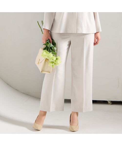 さらりとしたタッチときれいな表面感のカットソー素材を使用したパンツ。繊細なストライプ模様がさりげなく上品。