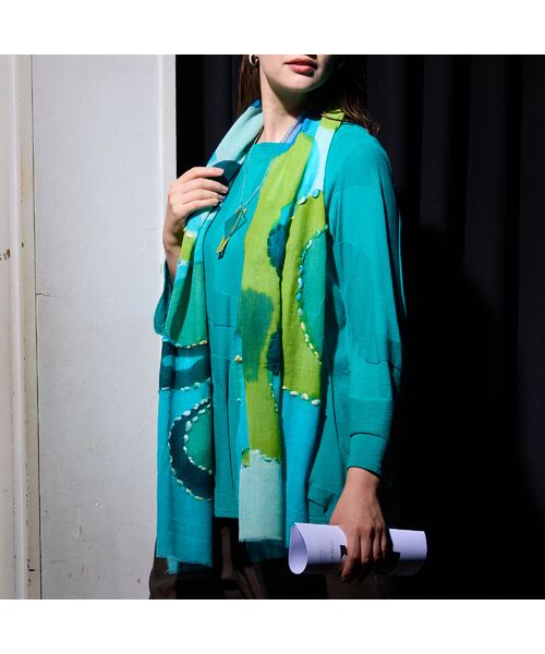 発色のキレイな薄手のウールを使用したストール。柔らかで繊細な手触り。一つ一つ手作業で描かれたプリント。ところどころステッチを効かせアクセントとなっています。