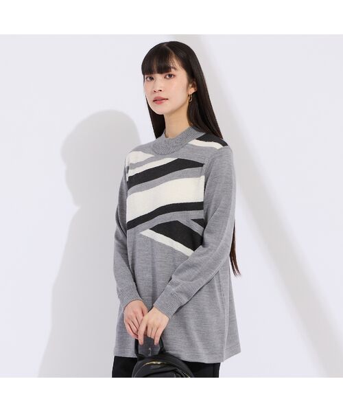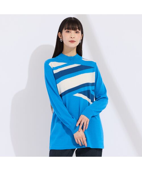 やわらかで膨らみ感のある糸を部分使いしたインターシャジャカードニット。グラデーションボーダーを重ねたようなデザイン。