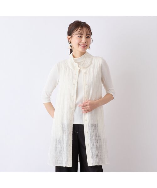 上品な透け感が大人っぽく涼し気なシアーチェック。同色の濃淡で表現している為落ち着きのある印象で着られます。ロング丈で気になる部分をカバーしつつ着られるのも嬉しい。