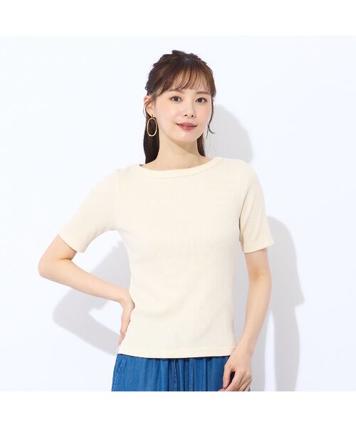 綿混素材のラメリブジャージー素材。着回しのしやすいシンプルなTシャツです。ややボートネックのデザイン。シンプルで着回しの効くアイテム。
