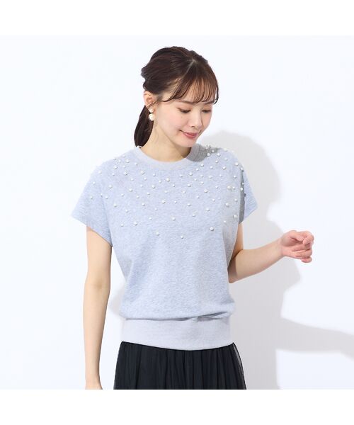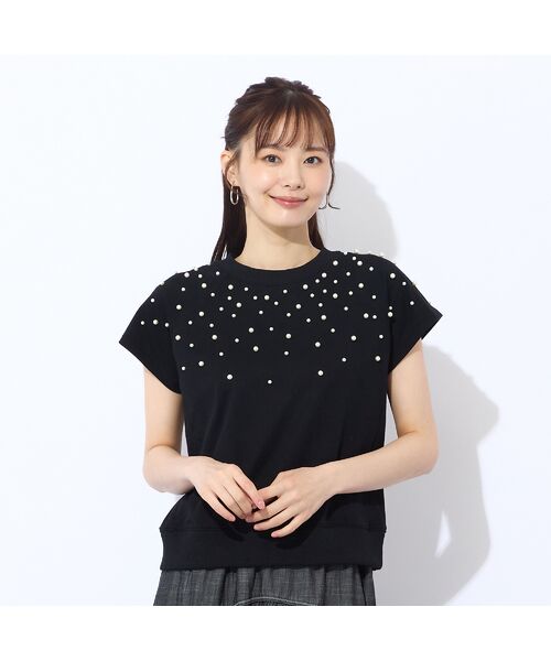 綿100%の裏毛素材にパールを散りばめたTシャツ。衿ぐり、裾部分にはリブを使用しています。カジュアル素材×可愛らしいパールがドッキングされています。程よい甘さのミックス感が絶妙。