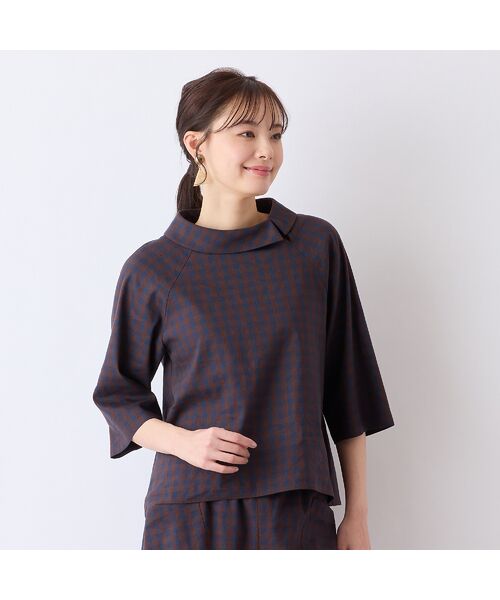 デザイン性のある衿がアクセントになったプルオーバーブラウス。左肩にコンシールファスナーがあり着脱することができます。