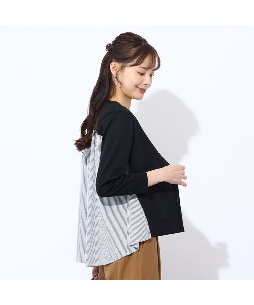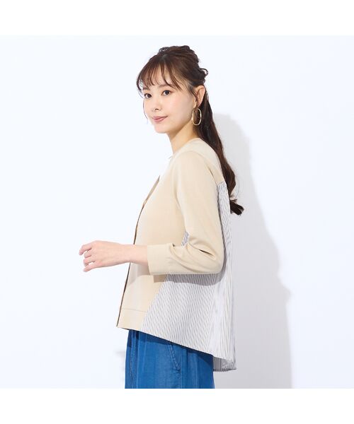 絶妙な撚糸感が心地よい綿混素材の柔らかなポンチ。サイドから後身頃にはストライプ生地を配色したデザインカーディガン。