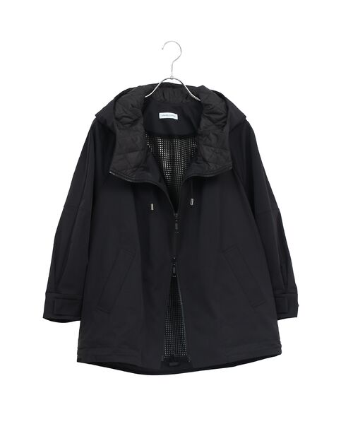 顔周りに高さの出る立体感のあるフードは内側をキルトで仕立て、異素材を取り入れることでスポーティになりすぎない柔らかなニュアンスを表現。後身頃下側にもキルトを使用しています。