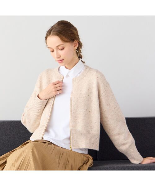 ローゲージの短め丈ニットカーディガン。カラーネップによるミックス調の表情がナチュラルで可愛らしい雰囲気を醸し出します。