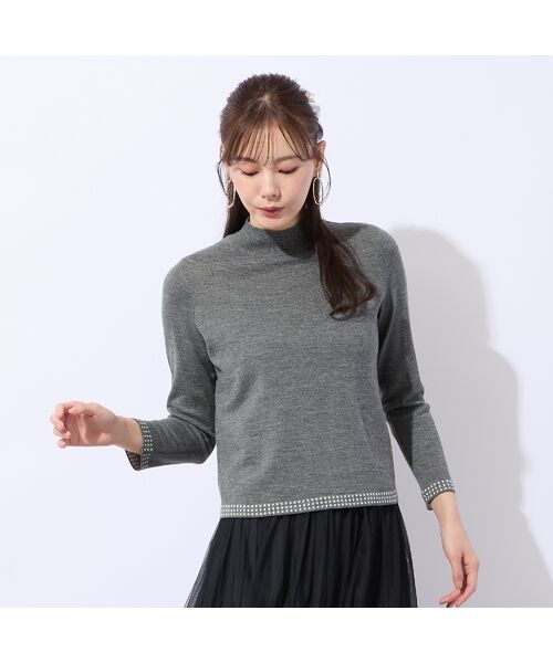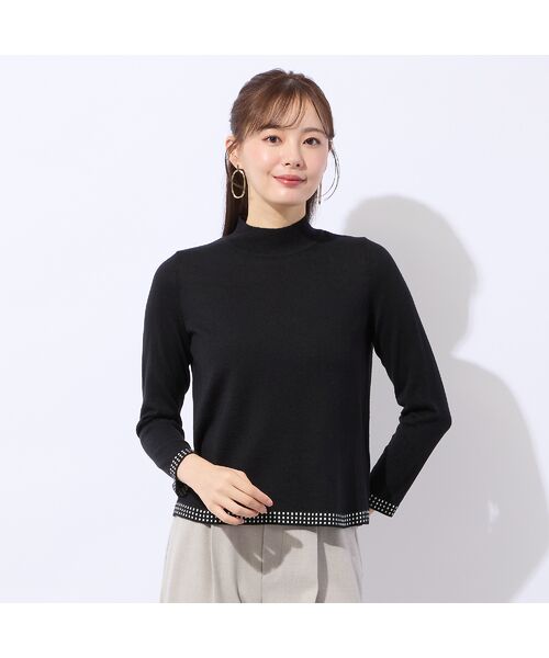 綺麗な目面とソフトな質感が特徴のニット。端に小さなスクエア柄を並べて縁取りしたデザインが上品。エレガントで女性らしいアンサンブルニットです。