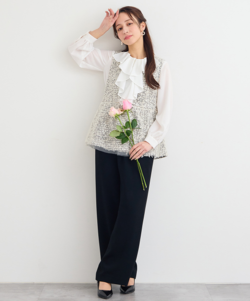 セレモニーなどの華やかなシーンにおすすめのアイテム。クラシカルな印象のツイードに繊細なチュールを重ね、ベストに仕立てています。