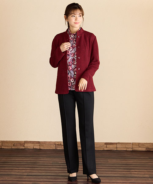 ディープな赤のジャケットとプリントインナーで楽しむソフトエレガンススタイル