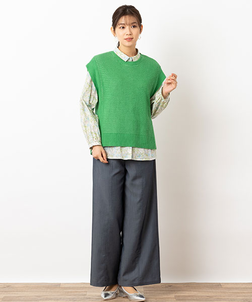 春にはニットベストやカーディガンとの重ね着がおすすめ。