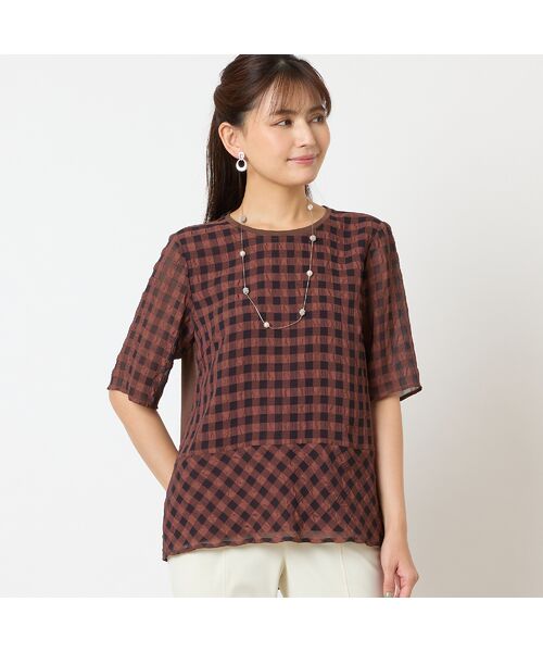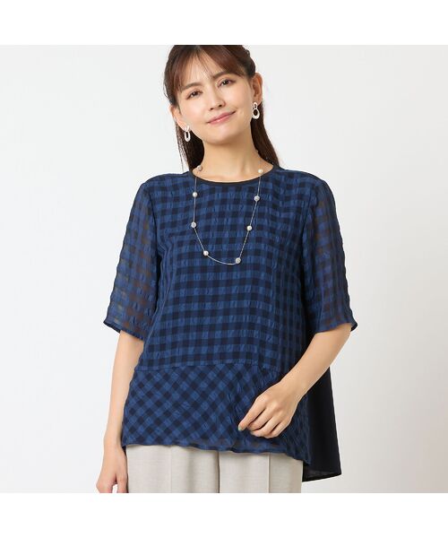 前身にシアー感のあるギンガムチェックを使用したトップスです。