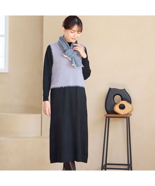 フェザーヤーンを使ってふんわりと編み上げたニットベストと、ふっくらとソフトな風合いのニットワンピースのアンサンブルアイテムです。