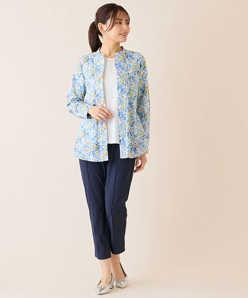 きれいな花柄シャツに同系色のパンツを合わせて軽快にコーディネート