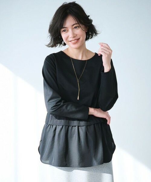 しなやかなシャツテールシルエットのコンビカットソー。肩が少しドロップしたほど良い抜け感のボディに、ウエストからギャザーを入れ、ヒップ回りが張りつかないように仕上げました。一枚で着るのはもちろん、ジャケットやカーディガンを羽織って裾のデザインをワンポイントにしても、クロップド丈のカットソーやニットのインナーとして裾をレイヤードさせてもバランスよく決まります。さまざまなスタイルにマッチし、つい毎日手に取りたくなる便利なアイテムです。カラーは清潔感のあるホワイト(#001)、印象が引き締まるブラック(#005)、やわらかな雰囲気のベージュ(#033)の3色展開です。