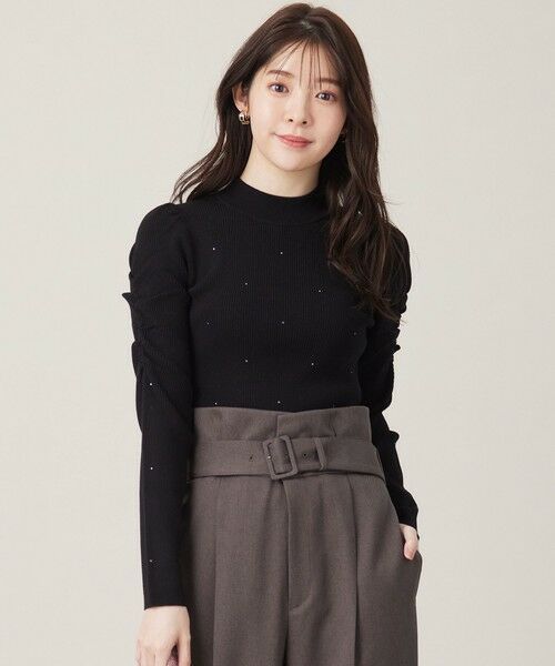 袖のギャザーデザインが着映えポイントのリブニットです。一枚はもちろん、ワンピースなどのインナーとしても活躍します。繊細なドットストーンがちりばめられており、上品でさりげないきらめきが華やぎ感をプラス。コーデに取り入れやすく、すっきりと着こなせる一着です。