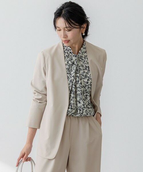 上品な印象のノーカラージャケット。インナーにTシャツを着ても、きれいめに見えるので同素材のテーパードパンツやワイドパンツに合わせて程よい抜け感のある新しいオフィススタイルにもお勧めです。ウエストを絞りすぎないラインと、ヒップにかかる丈のバランスが様々なボトムスと合わせやすいデザインになっています。袖口をロールアップして、こなれた着こなしも叶います。また、裏地がなくシワになりにくいので、出張の際の持ち運びにも対応しやすく、着脱後の手持ちの際などにも気軽にお取り扱いいただけます。カラーは、柔らかく肌なじみの良いベージュ(#033)、ニュアンスカラーのモスグリーン(#053)、シックでお仕事にもオススメのネイビー(#075) 、様々なシーンに対応できるブラック(#005)の4色展開です。
