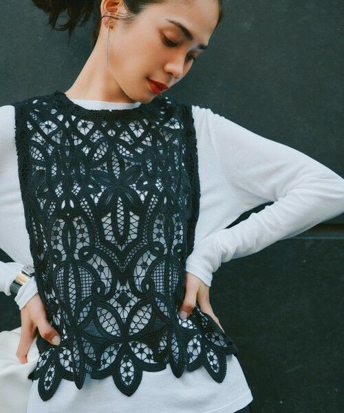 前身頃に繊細なレース生地をほどこしたニットベスト。後ろ身頃には総針編みのニット素材を使用しています。脇はニットの総針パーツで繋ぎ、襟もとはストレッチ性がないかわりに後ろ開きのスリットを入れています。裾レースのスカラップ使いが洒落感をプラスするポイントです。寒い時季はブラウスやカットソー、夏にはTシャツやタンクトップなどとレイヤードして、季節に合わせた着こなしを楽しめます。カラーは繊細で涼やかな印象のアイボリー(#002)とシックで甘さ控えめなブラック(#005)の2色展開です。