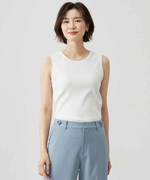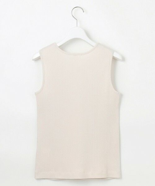 襟ぐりを少し詰めて、今年らしいデザインに仕上げたノースリーブカットソー。サテンテープとラメ糸を使用したロゴ刺繍を裾に施し、上品なデザインポイントにしています。前開きのブラウスやニットのインナーとして活躍するアイテムです。