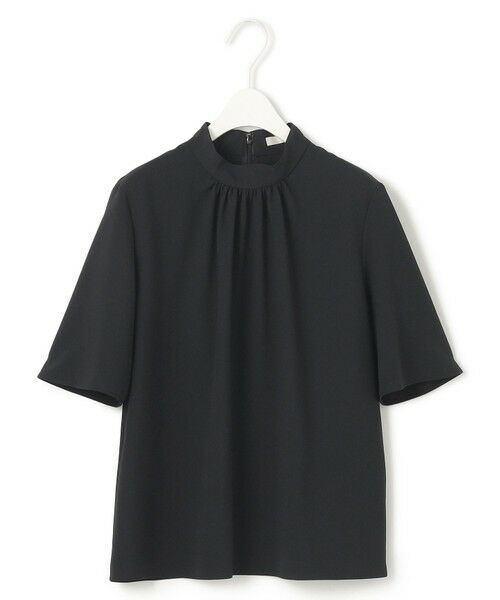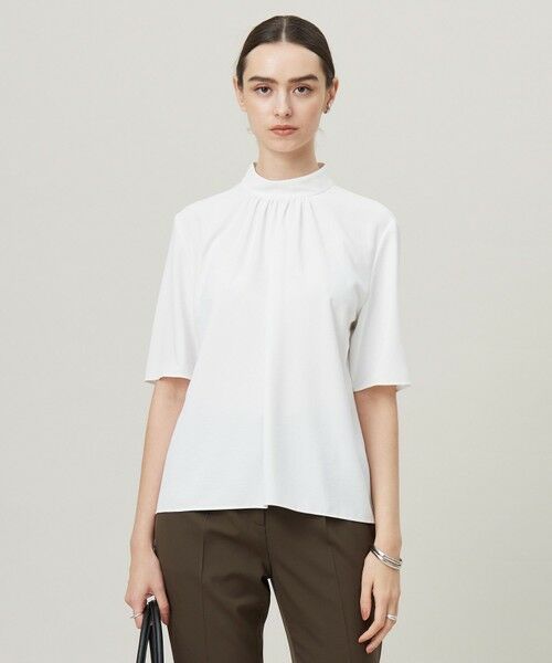 ■デザインハイネックと滑らかに入ったギャザーが特徴のブラウスです。一枚での着回しはもちろん、オフィスシーンでのスーツインナーにも活躍します。首元から胸元のかけてのギャザーがジャケットを羽織った際も、女性らしさを演出します。清涼感とストレッチ性がある素材なので着心地が良いのも嬉しいポイントです。