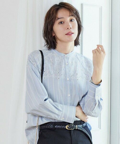 レース調の刺繍がお顔周りを華やげるシャツブラウス■デザイン前身頃の上部と袖の肩周りにレース調の刺繍をたっぷりと施したバンドカラーのシャツブラウスです。たっぷりと糸量を使って施した繊細な刺繍がお顔周りを華やかに見せてくれます。アームホールを大きく設定したラグランスリーブが肩周りにゆとりを生み、抜け感と女性らしさを感じられるバランスに仕上げました。釦を開けてシャツアウターとしても着て頂けます。■素材セルロース系再生繊維と綿を使用した、しなやかな風合いと程よい光沢感の素材です。滑らかなタッチで肌触りが良く、夏に向けて快適な着心地です。ストライプはブルーのシャンブレーに白のストライプが大きめのピッチで入った自由区オリジナルの柄です。先染めならではのストライプが美しく表現できるように無地と少し混率を変え、しなやかな風合いはそのままに程よく表情を感じるシャンブレー素材に仕上げました。■同素材アイテムプルオーバーブラウス(BLWMGM0408)
