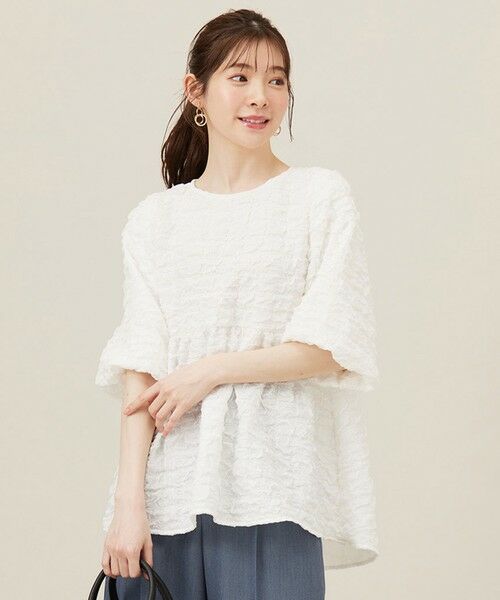 ・高めの位置で切り替えたペプラムギャザーはエアリーで軽やかな雰囲気・5分袖のバルーンスリーブで女性らしさをプラス・ヒップが気になりにくい長めの着丈感