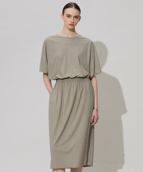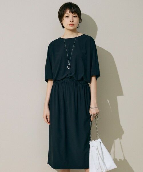 ■デザインスキューバ素材のドルマン型のワンピースです。トップス部分はゆとりを持たせ涼しく、スカート部分はすっきりシルエットできちんと感をプラス。ゴムギャザーのウエストマークでスタイルアップして見えるのも嬉しいポイントです。お仕事にはもちろん、旅行など様々なシーンで活躍します。