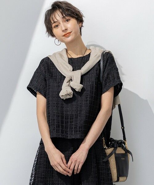 チェック柄のレース地がポイントのブラウスです。シンプルなデザインなのでボトムを選ばず、様々なコーディネートをお楽しみいただけます。同素材のスカートを合わせたセットアップスタイルもおすすめです。センターバックに施した金属ファスナーとグログランテープがアクセントになっています。カラーは印象がシックに決まるブラック(#005)と、抜け感のあるダークブラウン(#035)の2色展開です。