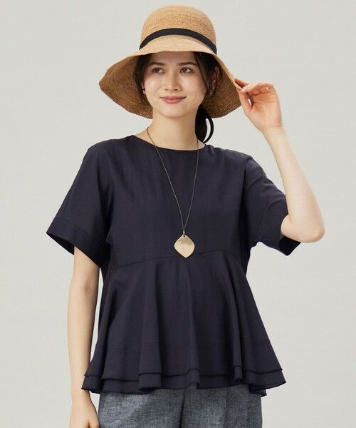 イレギュラーな切り替えがポイントのペプラムブラウス■デザインバストの下からイレギュラーな切り替えを入れた、たっぷりとしたフレアシルエットのペプラムブラウスです。ウエストよりも少し上の位置で切り替えることで、お腹や腰周りを程よくカバーしてくれます。トレンドの短めの着丈なので、ボリュームのあるワイドパンツと好相性です。程よくシアーな素材で生地の重なりで生まれる陰影が奥行を感じられ、1枚でサマになるブラウスです。シンプルなボトムと合わせるだけで華やかなコーディネートが完成します。■素材タテ糸にポリエステルの極細糸を使用し、ヨコ糸にセルロースと綿と麻の混紡糸を打ち込んだ透け感のあるシアー素材です。タテ糸のポリエステルが上品な透明感と適度なハリ感を醸し出しており、ヨコ糸でナチュラルなドレープ感を表現した程よく落ち感のある素材です。■同素材アイテムフリルディティールブラウス(BLWRGM0506)