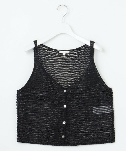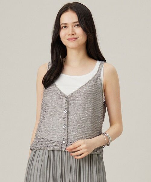 シンプルなコーディネートにプラスしたい涼しげなニットジレ■デザインかぎ針風の涼しげな編みが特徴のニットジレです。前開きのデザインですが、あえてしっかりと前を留めてキャミソール風に着て頂くのがおすすめです。シンプルなTシャツやタンクトップなどとレイヤードするだけで、コーディネートに華やかさをプラスしてくれるアイテムです。■素材光沢感があり、コード撚りした目の立つ表情豊かなサマーファンシーヤーンです。イタリア糸ならではの繊細な色味と立体感が特徴の糸です。