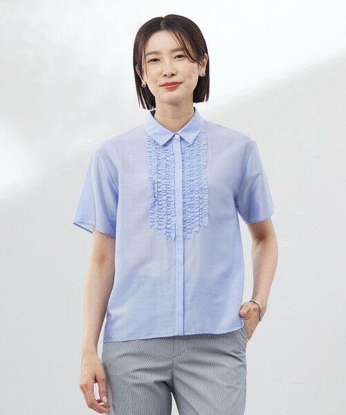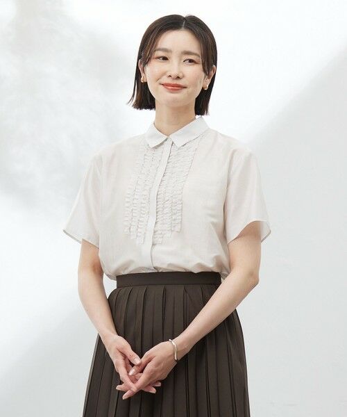 ■デザイン繊細なフリルがあしらわれた、甘さ控えめなブラウスライクカットソー。シャツ襟デザインが程よくキチンと感をプラスし、ノースリーブをインに仕込んで羽織ブラウスとしても、前を留めて1枚で着こなしてもサマになる汎用性の高さが魅力です。コンパクトなシルエットが上品な印象を与え、通勤スタイルにも馴染むアイテム。シンプルなパンツやスカートと好相性で、着回し力抜群です。