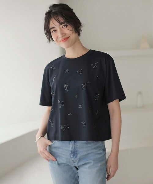 大人に似合うさりげない華やかさが魅力!スパンコールTシャツ■デザイン少し短めの着丈が軽やかな印象を与える、ボックスシルエットのスパンコールTシャツ。同色のスパンコールモチーフがさりげない華やかさのある、シンプルながらも存在感のある1枚に仕上げました。柄ボトムスとも相性がよく、コーディネートに幅を持たせられるのも魅力。袖はやや広めで風通しがよく、暑い夏でも心地よく過ごせるデザインです。デイリーからお出かけまで、どんなシーンにも溶け込み、さりげなく目を惹く主役級のTシャツです。■素材細い綿糸を2本合わせて編み上げた天竺素材を使用。綿ならではの柔らかな肌触りに、シルケット加工を施すことで程よい光沢感とサラッとした着心地をお楽しみいただけます。※商品画像はサンプルを使用しているため、色味やサイズ等の仕様に変更がある場合がございますので、予めご了承ください。洗濯表示【本体のみ】40℃まで弱洗濯可 塩素系漂白不可 タンブル乾燥不可 日陰つり干し乾燥 アイロンは160℃まで ドライクリーニング(石油系)可 弱いウェットクリーニング可