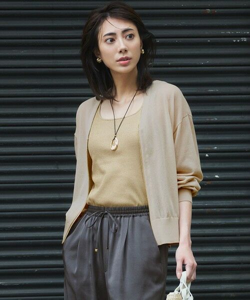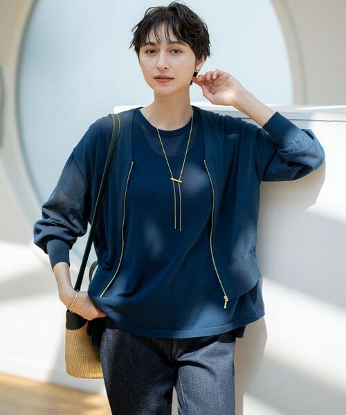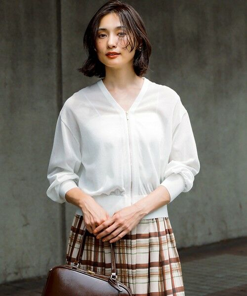 透け感のあるニットブルゾン。ゴールドカラーのファスナーもアクセントに効いています。襟元はVネックで、ファスナーを開けてもすっきりと着用していただけるように仕上げました。ファスナーを閉めるとブラウジングしたシルエットになる様にしています。薄手素材ながら長袖にし、真夏の強い日差しや、冷房対策におすすめです。カラーは爽やかなホワイト(#001)、印象引き締まるブラック(#005)、やわらかな雰囲気のベージュ(#033)、洗練された印象のダークブルー(#065)の4色展開です。