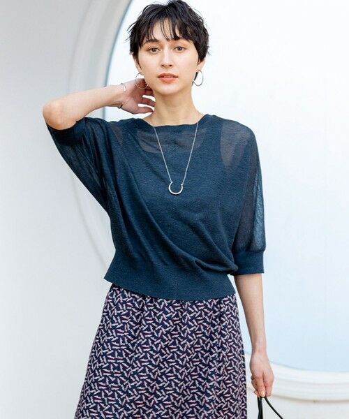 アームの締め付けのない、ドルマンスリーブの5分袖カーディガン。二の腕をカバーしつつ、上品な透け感のある素材で涼し気な印象です。襟はクルーネックで前後着用できるようにしています。裾のリブが腰で止まるような作りなので、コンパクトなプルオーバー風に着るのがおすすめです。カラーは、抜け感のあるアイボリー(#003)、ベーシックなブラック(#005)、ナチュラルな印象のブラウン(#030)、こなれ感のあるダークグリーン(#065)の4色展開です。