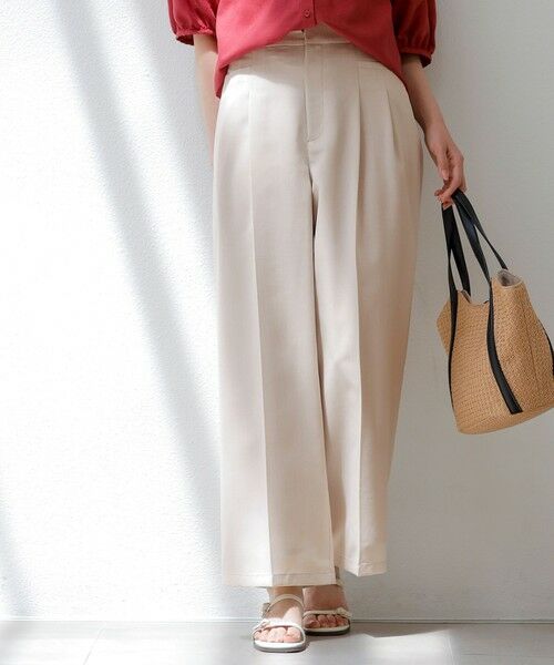 ・程よく入ったデザイン性がスタイリングにアクセントを与える、トレンド感のある2タックワイドパンツ・両脇のポケットデザインがシンプルになりがちな夏のスタイリングのポイントに・ベルト前中心に施したカットデザインがウエストインした際にさり気なくデザイン性をプラス・綺麗な腰周りと程よいワイドシルエットでフェミニンな中にもハンサムさを感じるデザイン・センタープレスにはセンタークリース加工を施しています